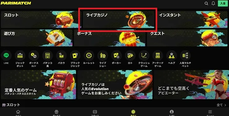 Evolutionのバナーを選択すれば、Evolutionが提供するライブゲームが表示されます。