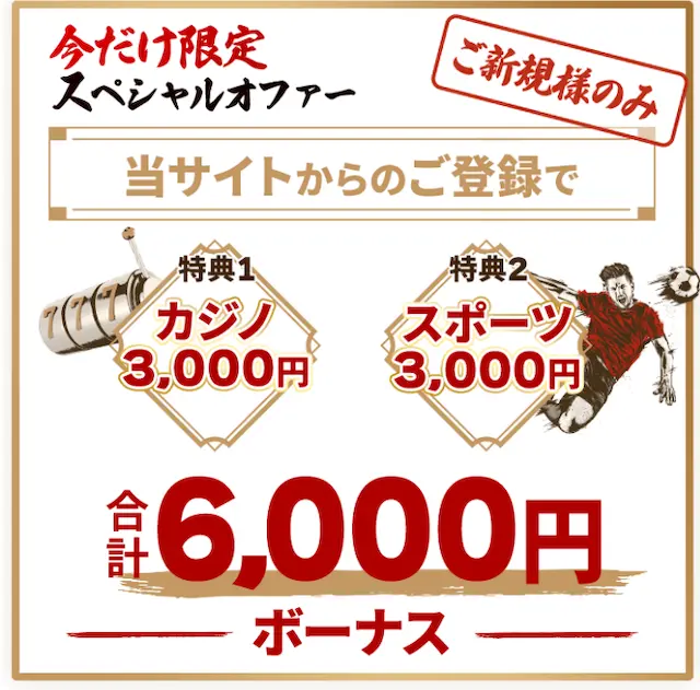 【全カジノゲームで使える3000円】+【スポーツボーナス3,000円】が進呈されます!賭け条件はたったの20倍とかなり甘めの分離型となっています。