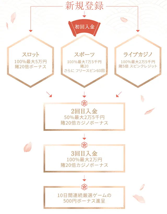 | 2回目入金 | 最大25,000円の50%ボーナス | 20倍 | お好きなカジノゲーム |