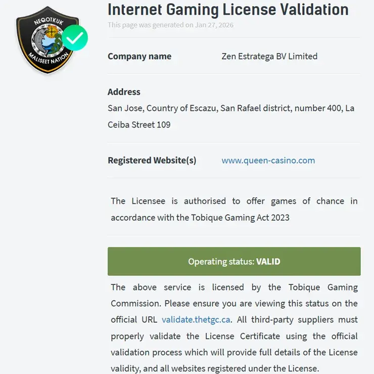 クイーンカジノは、「Zen Estratega BV Limited」という企業によって運営されています。登録住所:400, Calle La Ceiba, San Rafael, Escazú, Province of San Jose, Costaによライセンスを取得して運営されています。