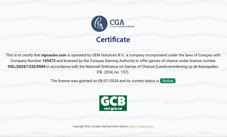 XIPカジノは、キュラソー政府発行の公認ライセンス(番号OGL/2024/1232/0584)を取得し、公正に運営されています。